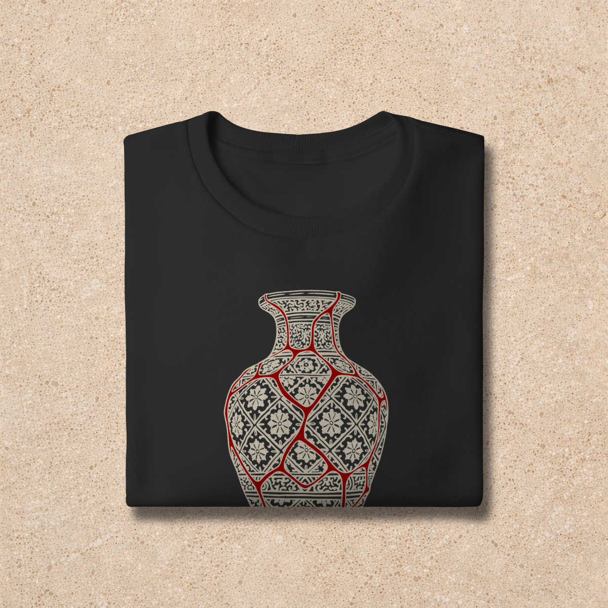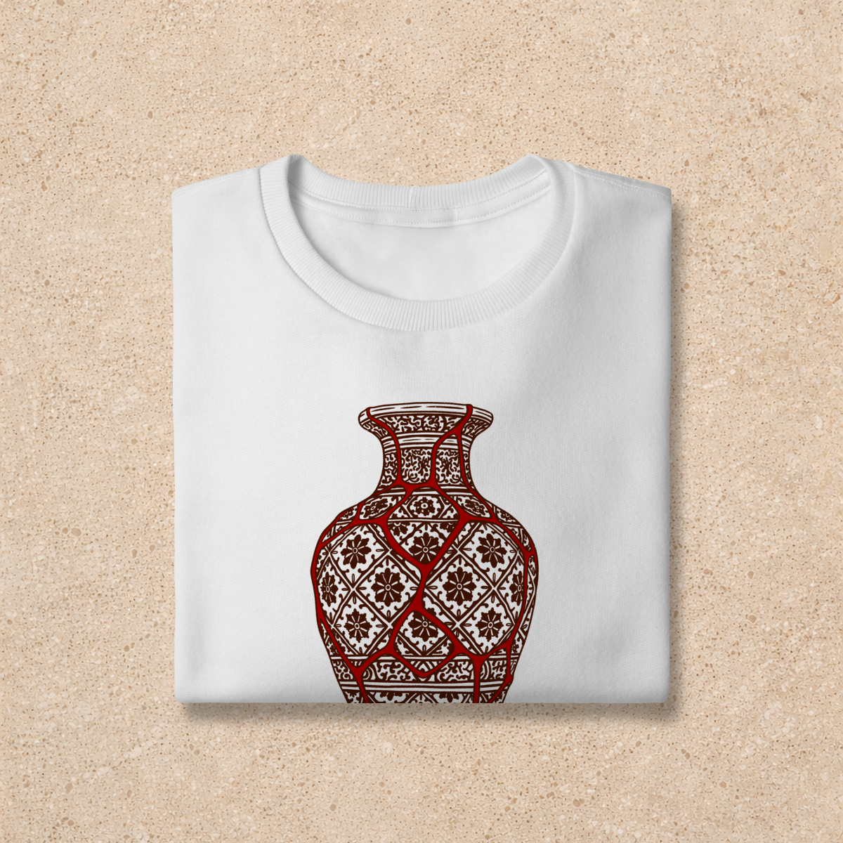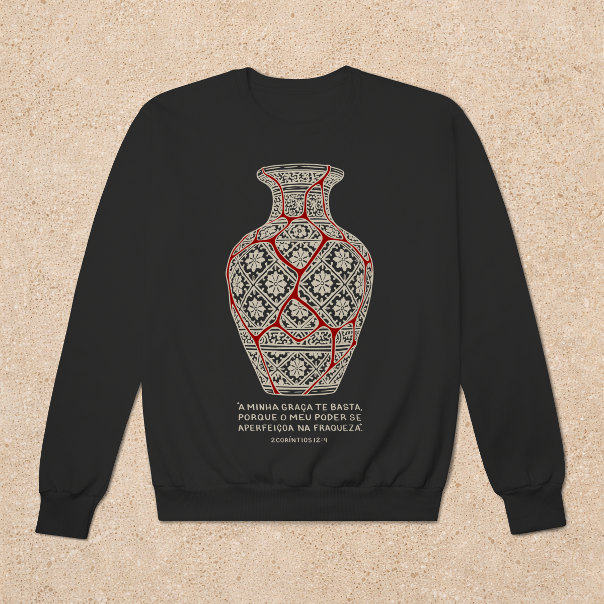 Antes de conhecermos a Cristo, estávamos todos quebrados... Como um vaso de cerâmica estávamos em cacos, destruídos pelo pecado e suas consequências. Mas, quando tivemos um encontro com a sua Graça, os cacos voltaram ao propósito e posições originais, fomos transformados, nos tornamos novas criaturas redimidas pelo Sangue do Cordeiro. Mas o pecado ainda está no mundo, embora salvos, ainda pecamos, embora refeitos, ainda temos rachaduras... "Ainda", enquanto não chega o grande Dia do Senhor. No Reino eterno que virá corações não vão mais doer, mas neste mundo eles ainda doem... Na Nova Jerusalém seremos fortes, mas neste mundo ainda temos fraquezas... Mas ânimo! Recebemos promessas! Promessas de que o Senhor sempre estará conosco e que, como diz 2 Coríntios 12:9, Seu Poder e Sua Graça estarão presentes nos nossos momentos de fraqueza. E é baseada nessa promessa que nossa estampa "Beleza na fraqueza" surge! A ilustração é baseada em uma antiga técnica Japonesa chamada Kintsugi, que consiste em unir peças de cerâmicas quebradas usando ouro, evidenciando e ressignificando as falhas daquele objeto que antes seria descartado, e transformando-o em arte. Na nossa vida espiritual somos como um vaso restaurado, mas não com ouro, e sim com o Sangue de Cristo, que preenche nossas fraquezas com poder e ressignifica nossas falhas para a glória do Seu nome, sendo capaz de fazer nossas feridas curarem outras pessoas, e trazendo beleza e propósito onde antes só haveria dor e vazio.