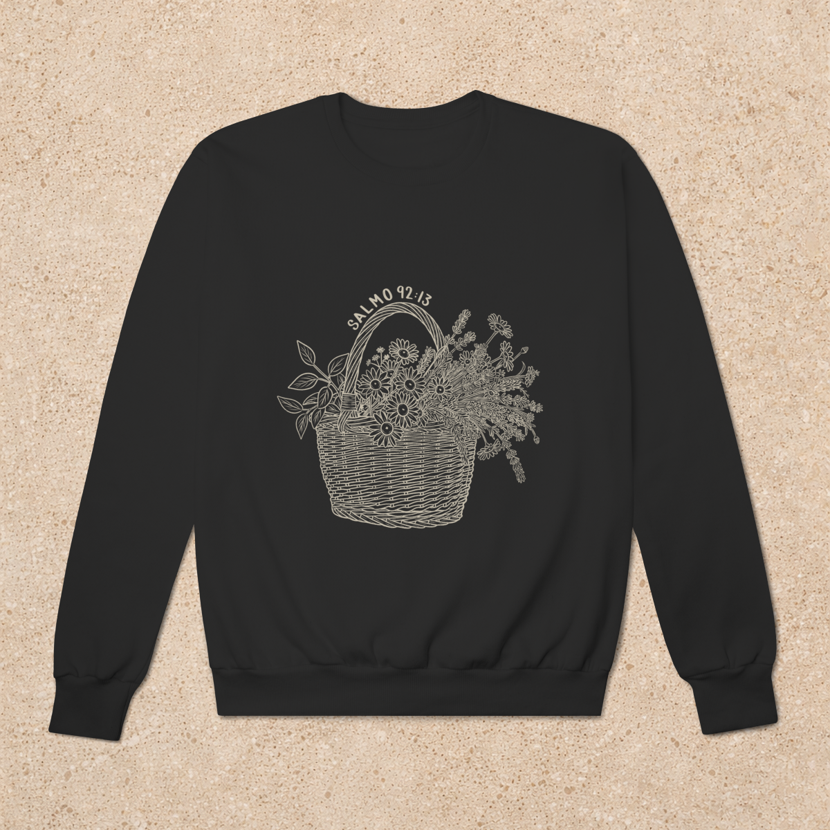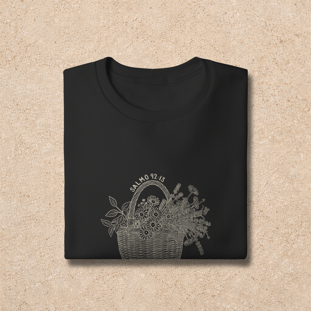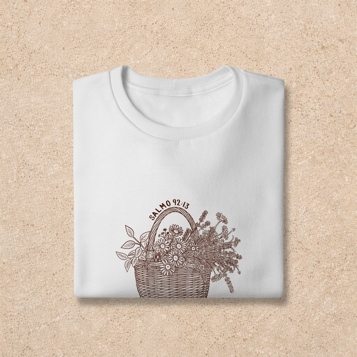 O salmo 92 contém uma serena e profunda promessa de vitalidade e longevidade espiritual aos que são "Plantados na casa do Senhor". Não se trata de um crescimento ocasional, mas de um enraizamento intencional e seguro na presença de Deus, no lugar de adoração e comunhão, onde esse enraizamento vislumbra a promessa de um florescimento garantido. E é esse "Florescer" que nossa estampa simboliza através do cesto cheio de flores. Não importa a idade ou as estações da vida, aqueles que mantêm seu vínculo com Deus exibirão beleza, fruto e vigor. O Senhor é belo, ele possui tudo que é desejável e só Ele é capaz de nos saciar, e quando estamos satisfeitos nEle o glorificamos com mais sinceridade e força. Ele que nos planta, nos nutre e nos faz florescer no tempo devido, não para exibir a nossa própria beleza, mas a dEle! Fomos chamados para exalar o perfume de Cristo e a sua reputação onde estivermos, mas para isso precisamos estar com nossas raízes na fonte de Água Viva que é o Senhor.