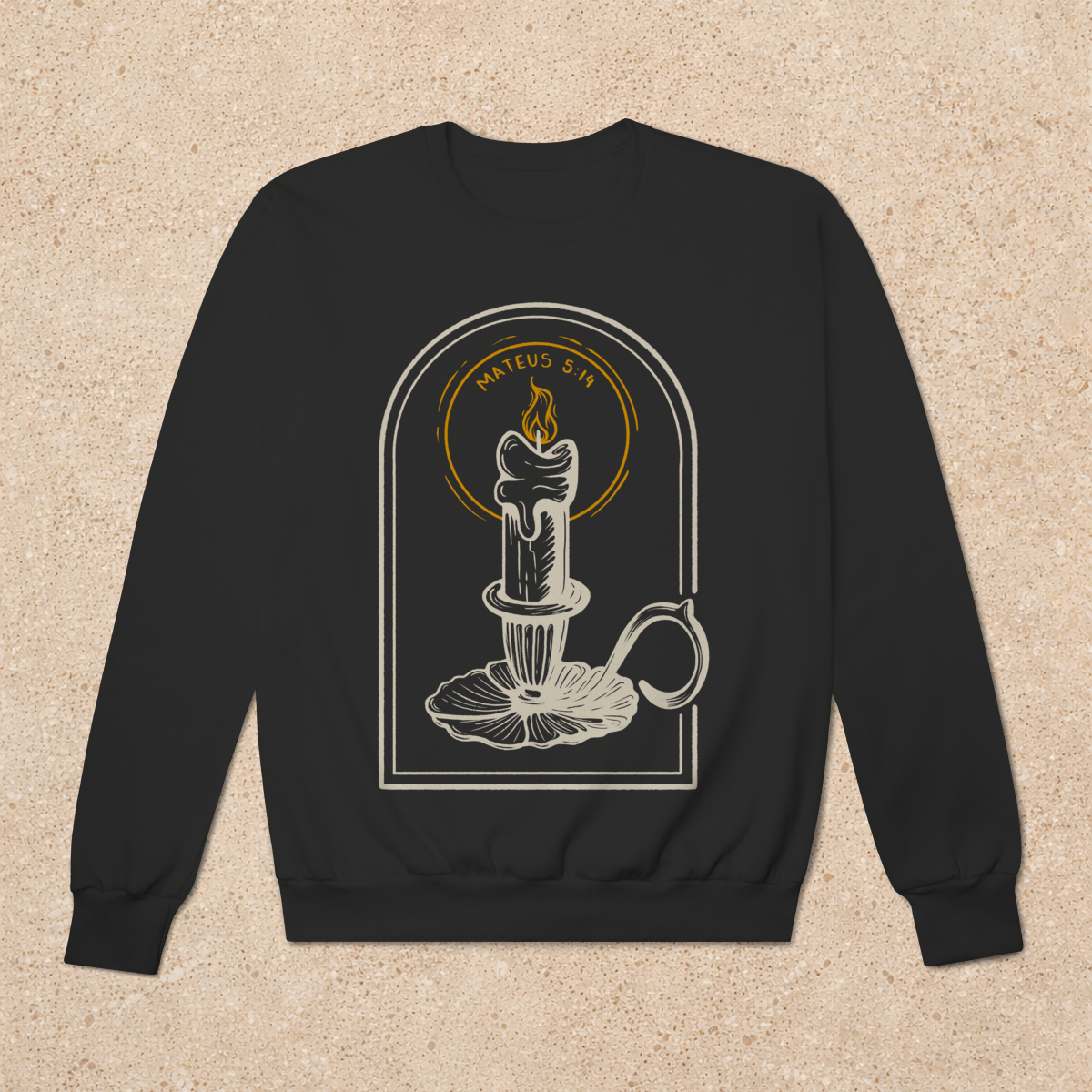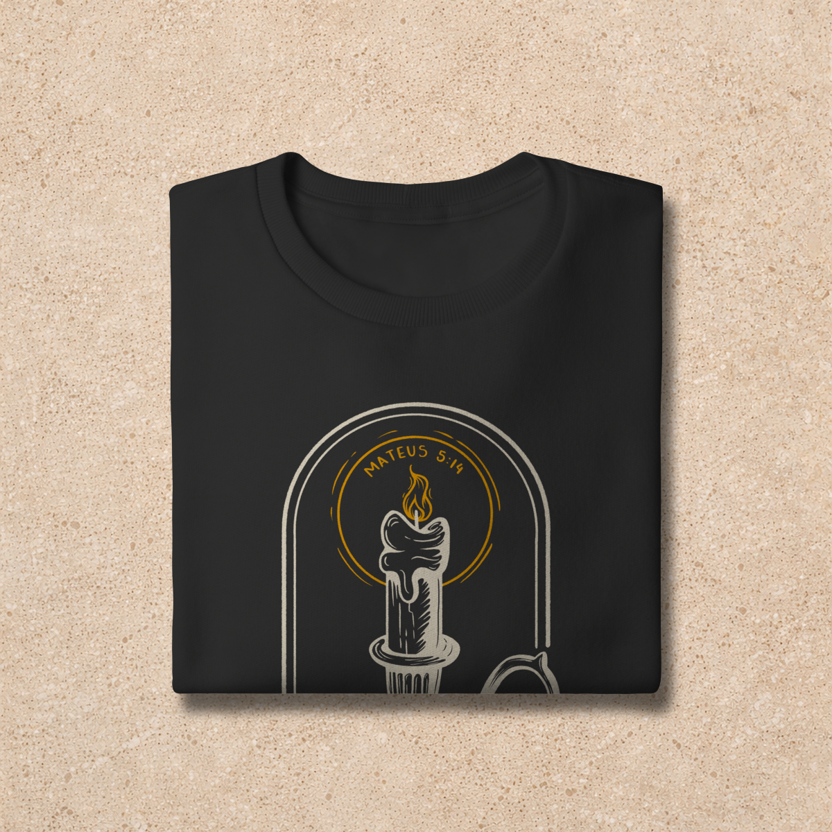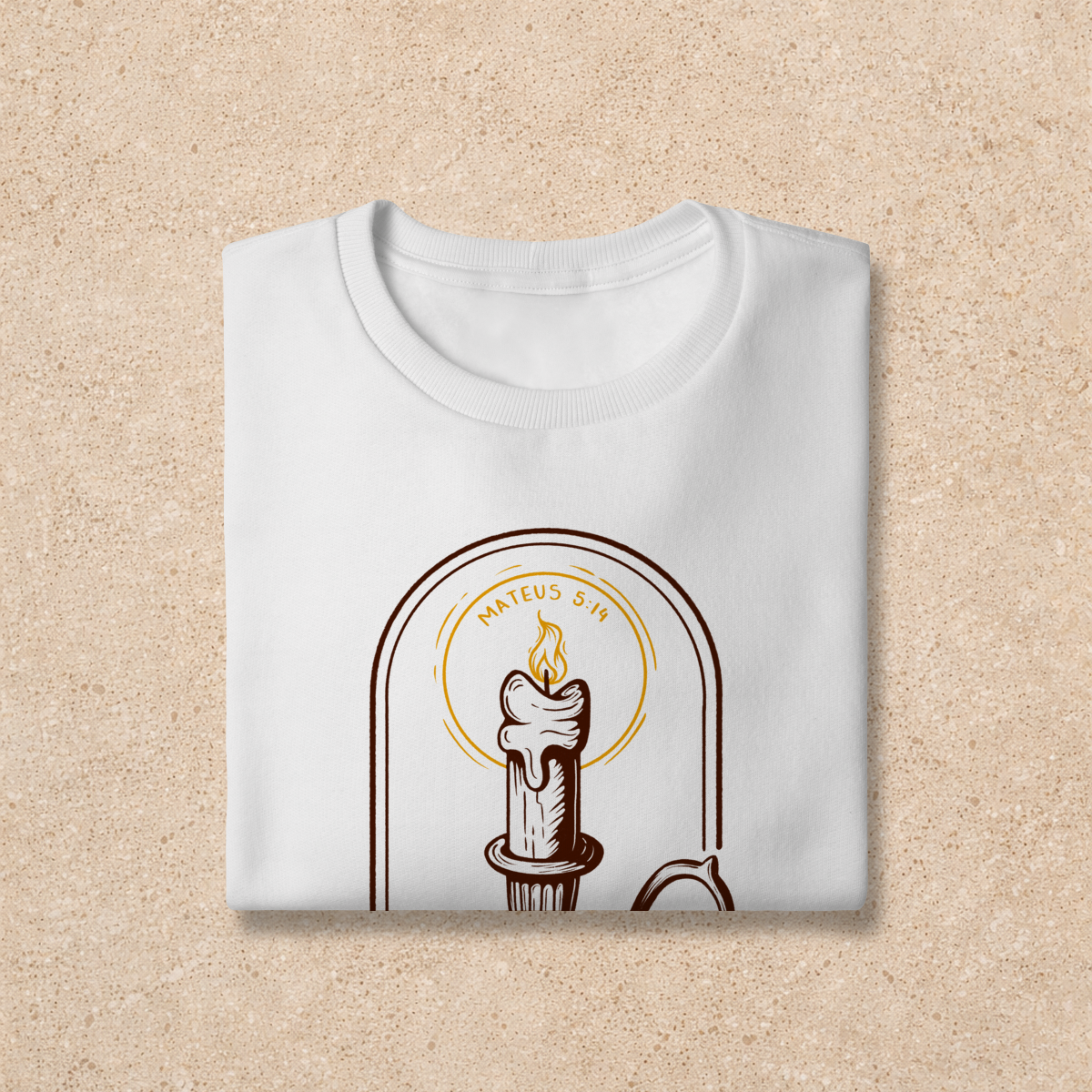 No capítulo 5 de Mateus temos o maior Sermão público feito por Jesus, o Sermão do Monte. Tais ensinamentos são considerados por muitos teólogos como a "Constituição do Reino de Deus", pois dita a maneira como os cidadãos do Reino dos céus vivem. Em uma das maravilhosas passagens contidas nesse sermão está a famosa frase: "Vocês são a luz do mundo". Baseando-se nessa declaração, nossa estampa "Luz no mundo" celebra o chamado para o testemunho visível. A vela acesa no castiçal é o símbolo de uma fé que não pode ser escondida. É tempo de remover o "alqueire" e deixar que a luz, a verdade e o amor de Cristo transformem o ambiente ao seu redor. Vista este lembrete de que sua vida é como uma vela, ilumine as pessoas ao seu redor com a Luz do Senhor que você carrega! O mundo jaz em trevas, mas o nosso Deus nos levantou para trazer clareza, direcionamento, revelação e entendimento para os que não O conhecem. Não esconda essa chama!