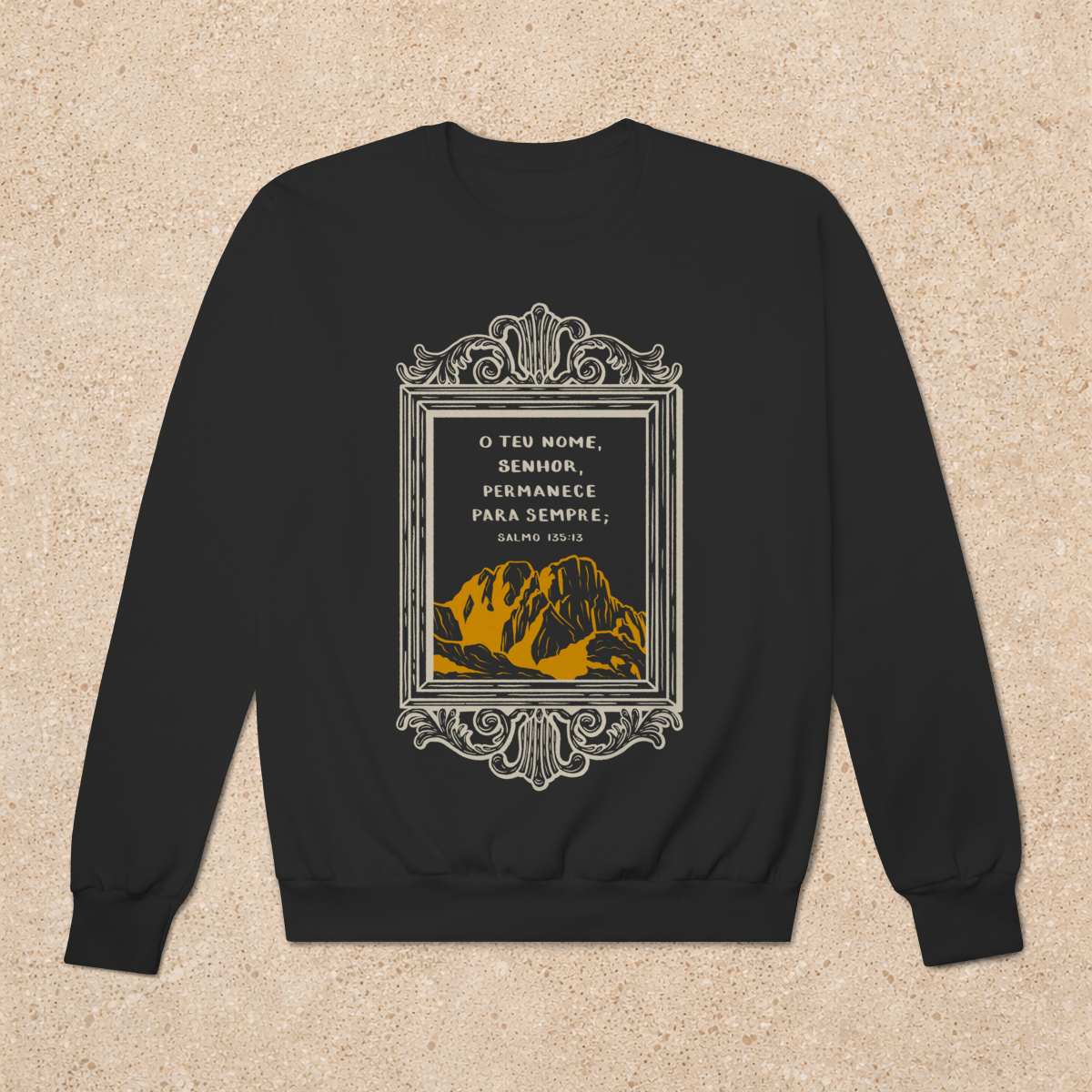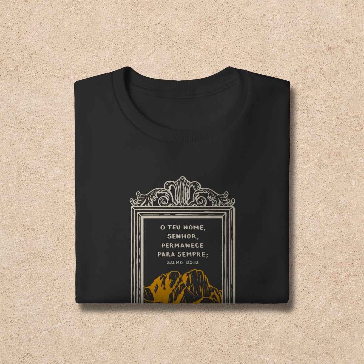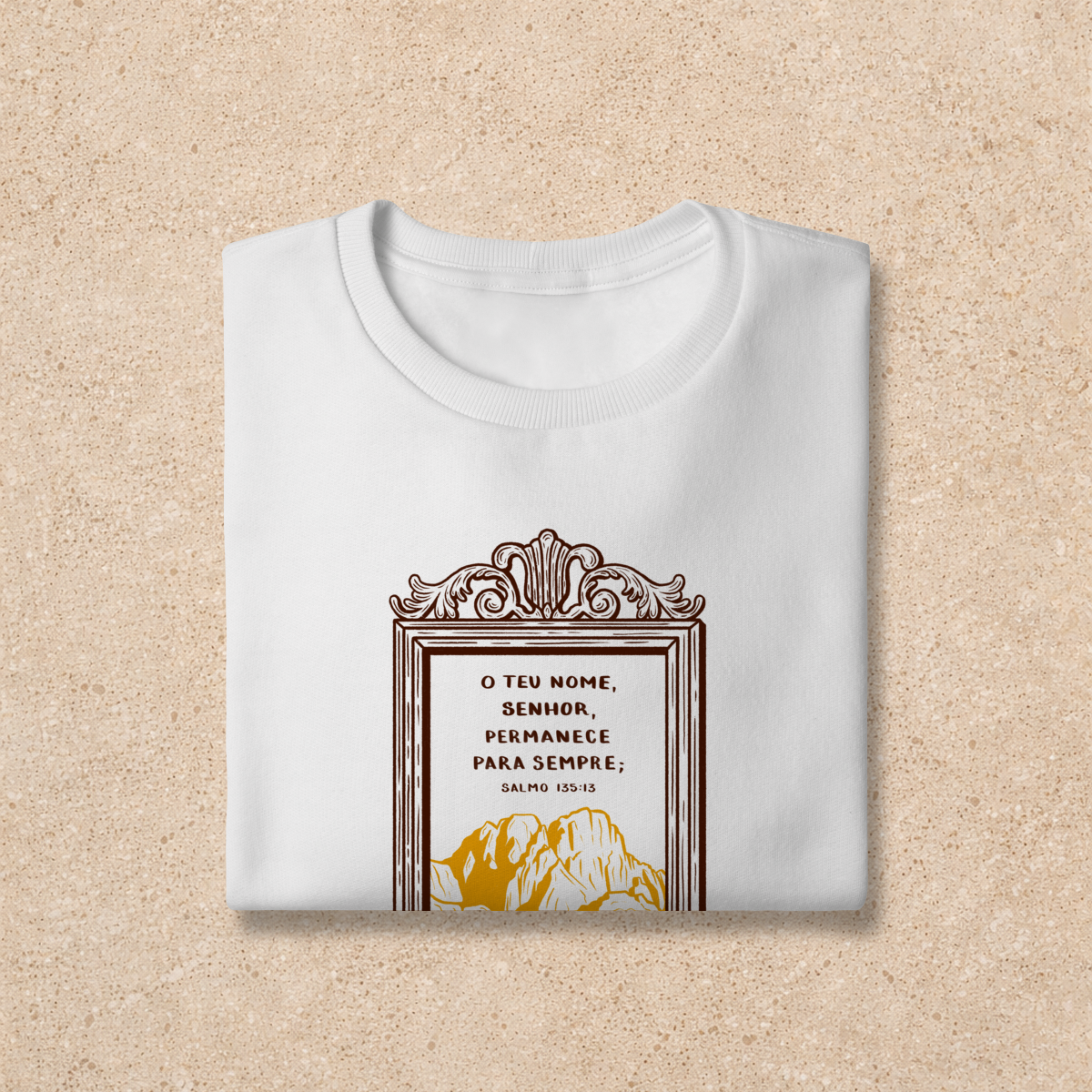 Nossa estampa, como o próprio nome já diz, carrega a poderosa e consoladora verdade do Salmo 135, mais especificamente do versículo 13: "O teu nome, Senhor, permanece para sempre." Esse texto é uma profunda meditação sobre a eternidade e a imutabilidade de Deus. No contexto bíblico, o "Nome" de Deus (YHWH) não é apenas uma palavra, mas a plena revelação do Seu caráter, poder, e glória. Dessa forma, dizer que Seu Nome permanece para sempre é afirmar que: Sua Identidade é Eterna, pois ao contrário dos deuses criados pela mão humana, cuja fama e poder desvanecem, o Deus de Israel é Aquele que É, que Era e que Há de vir, o Seu caráter é imutável; Sua Soberania é Inabalável, já que suas obras são eternas e garantem que o plano redentor de Deus é certo, a Sua autoridade nunca será questionada; A Memória das Gerações, onde na expressão em hebraico para "permanece" (לְדֹר וָדֹר – lĕdōr wādōr) frequentemente significa "de geração em geração", nos lembrando que cada nova era é chamada a testemunhar e a honrar o mesmo Deus que agiu no passado. Na ilustração, a imagem usada para simbolizar a permanência do Senhor foi um monte, mais especificamente o monte Sinai, que permanece em pé desde a antiguidade até hoje e foi palco de grandes manifestações do poder de Deus no período de peregrinação de Israel no deserto, é um lembrete natural do inabalável plano de Senhor. E mesmo que o monte Sinai se torne ruína algum dia, a Palavra do Senhor permanecerá para sempre, e sempre!